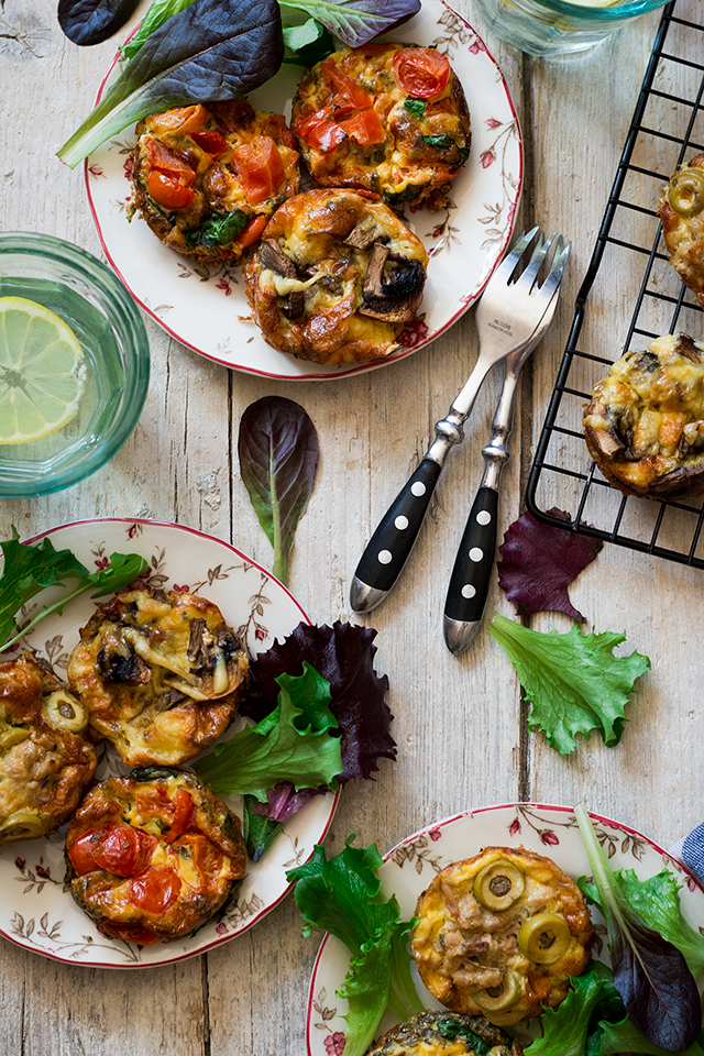 No me digáis que no son apetecibles, y lo mejor de todo es que podéis añadir tantos ingredientes y combinaciones como queráis, aprovechando restos que tengamos por la nevera, como anchoas, queso feta o cualquier verdura que se nos quede en el fondo del cajón. Si tenéis mezcla de quesos el resultado será delicioso.
